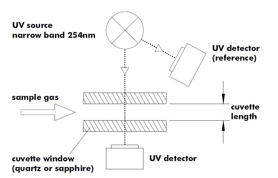 樣品氣體(臭氧和載氣,通常是氧氣或空氣)在兩個(gè)平行的窗口之間流動(dòng),這是透明的254納米輻射。這些試管窗戶是用石英或藍(lán)寶石制成的。比色管窗口之間的距離(比色管長(zhǎng)度)定義了測(cè)量范圍和儀器的靈敏度。例如,200 g/m3的比色管長(zhǎng)度通常只有0.8 mm, 400 g/m3的比色管長(zhǎng)度通常為0.4 mm。